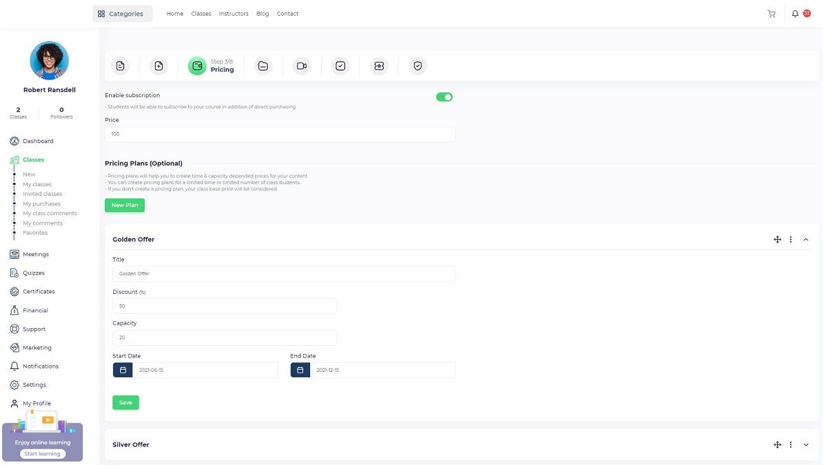 Partner instructor: If you want to invite another instructor to your course, you should turn this toggle on so the partner instructor dropdown will be displayed and you will be to add single or multiple instructors to the course. The invited instructor profile will be displayed on the course page and the invited instructor will be able to view the course through the “Instructor panel/ Classes/ Invited classes”.