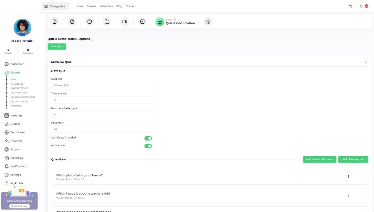 Description: The class description that will be displayed on the class page includes all of the information about the course educational material, instructor, and other related information that will motivate viewers to enroll in the course. We suggest writing at least 300 words for this page because it is one of the most important SEO requirements.
