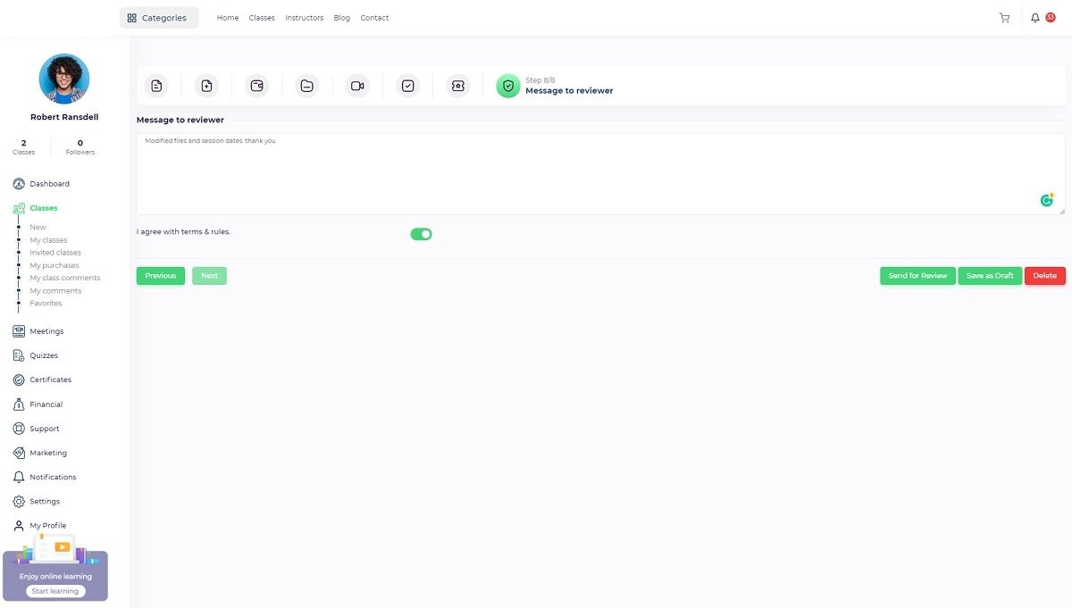 In this step, the instructor should agree on terms and rules. If there are important points for a reviewer, the instructor can write them in the message field.