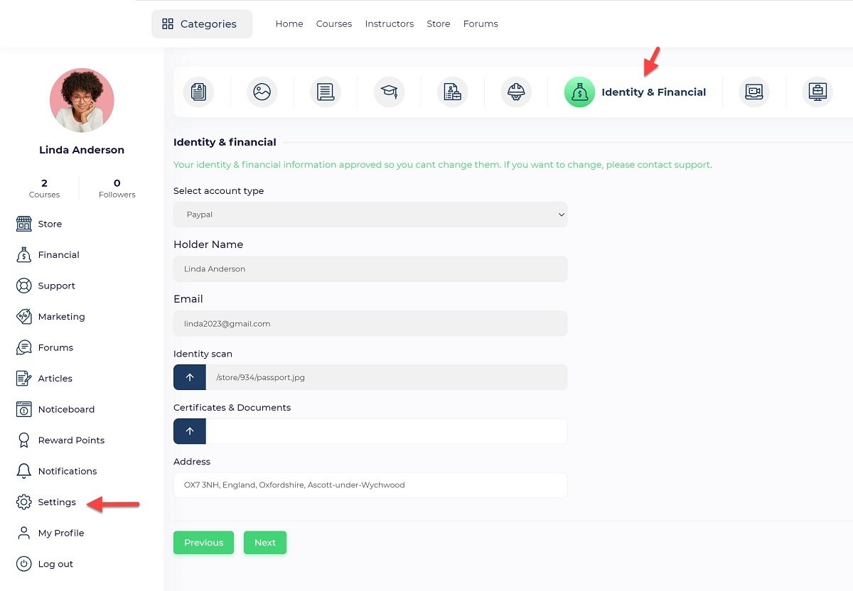Users can define their payout account information from the “User Panel/ Settings/ Identity & Financial” menu.