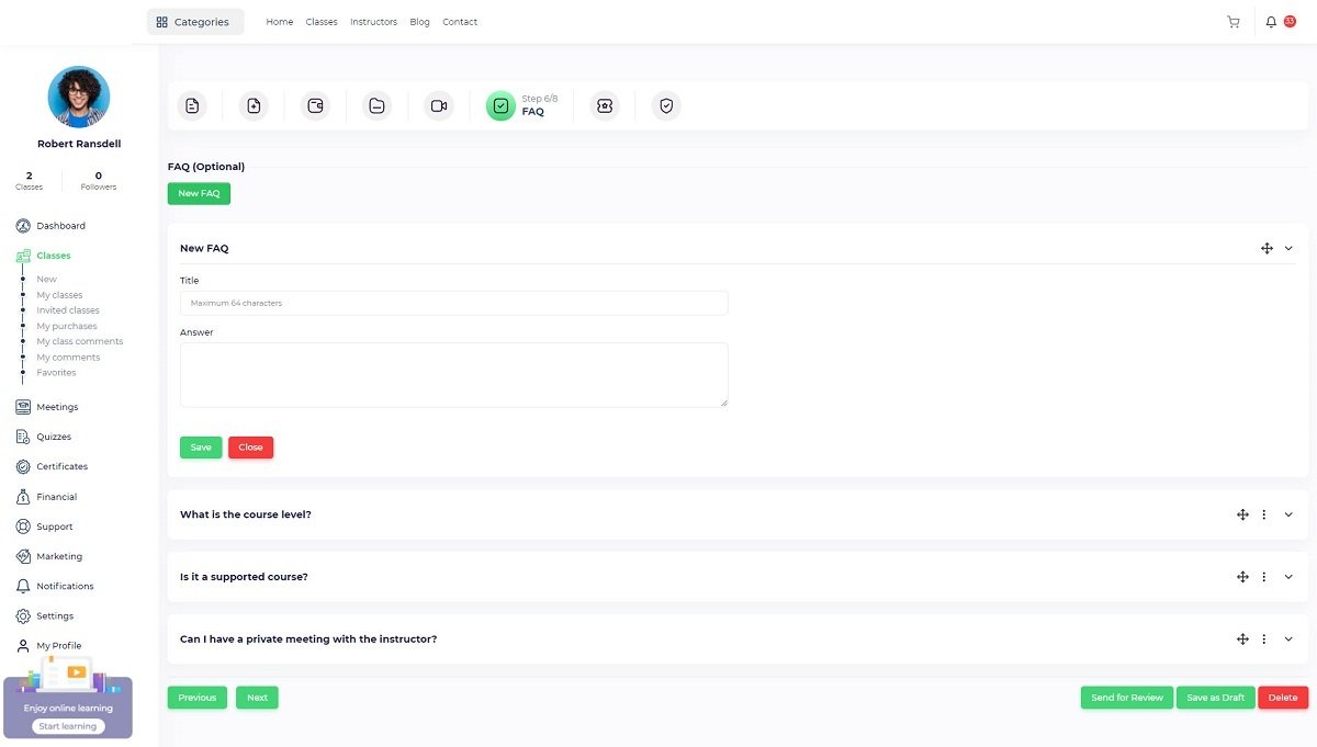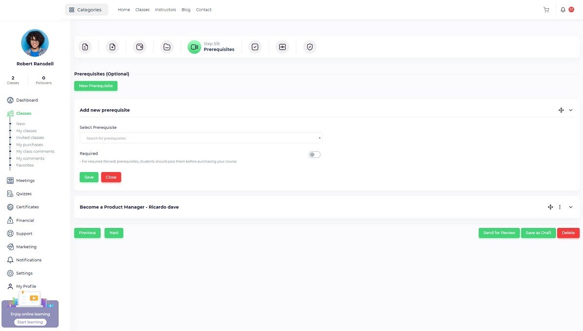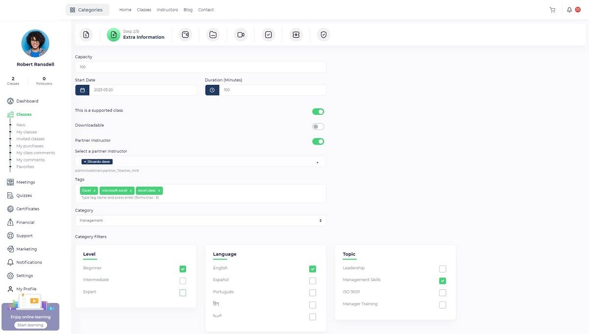 Partner instructor: If you want to invite another instructor to your course, you should turn this toggle on so the partner instructor dropdown will be displayed and you will be to add single or multiple instructors to the course. The invited instructor profile will be displayed on the course page and the invited instructor will be able to view the course through the “Instructor panel/ Classes/ Invited classes”.