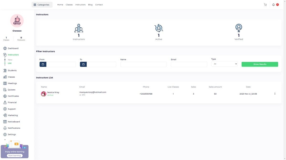One of the organization's accounts features is exclusive instructors and students. Organizations can define the related students and instructors from their panel under the “Instructors” and “Students” menus.