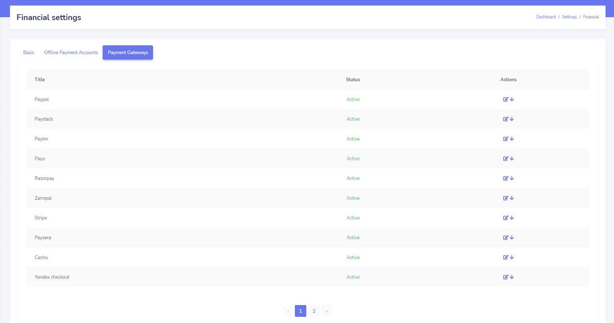 - Activate your favorite payment gateways from the admin panel: In this step, you will specify which payment gateways will be displayed on the platform frontend during different payment processes. Go to "Admin Panel/ Settings/ Financial/ 'Payment Gateways' tab" and enable/disable each payment gateway.